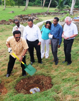 Accompanied by Environment, Energy and Climate Change Minister Didier Dogley, principal secretaries, chief executives and other officials of the ministry, President Remengesau Jr planted a coco-de-mer seed at the arboretum of the National Biodiversity Centre at Barbarons.